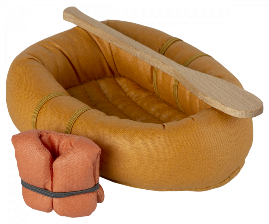 Neliela gumijas laiva izgatavota no auduma komplektā ar glābšanas vesti un airi. Laiva nav ūdensdroša, paredzēta sausai videi.